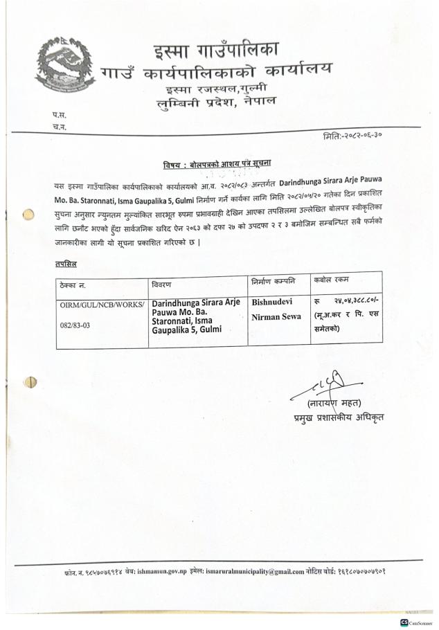 बोलपत्रको आशय पत्र सूचना ।