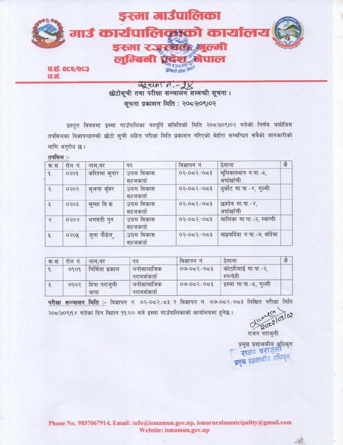 छोटोसूची तथा परीक्षा सञ्चालन सम्बन्धी सूचना