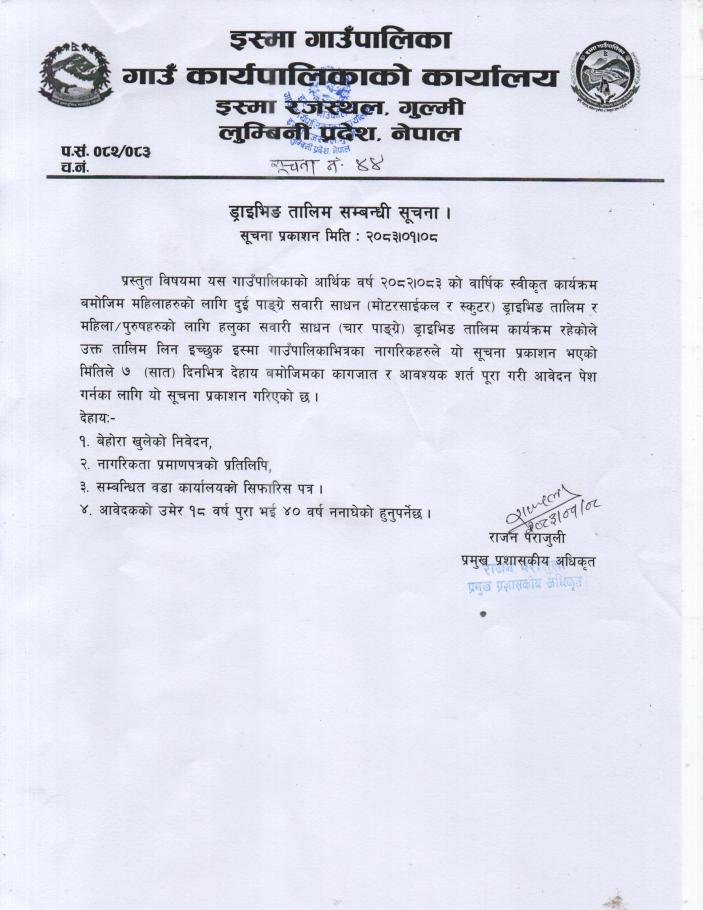 ड्राइभिङ तालिम सम्बन्धी सूचना ।