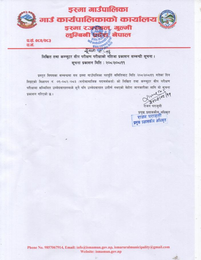 लिखित तथा कम्प्युटर सीप परीक्षण परीक्षाको नतिजा प्रकाशन सम्बन्धी सूचना ।