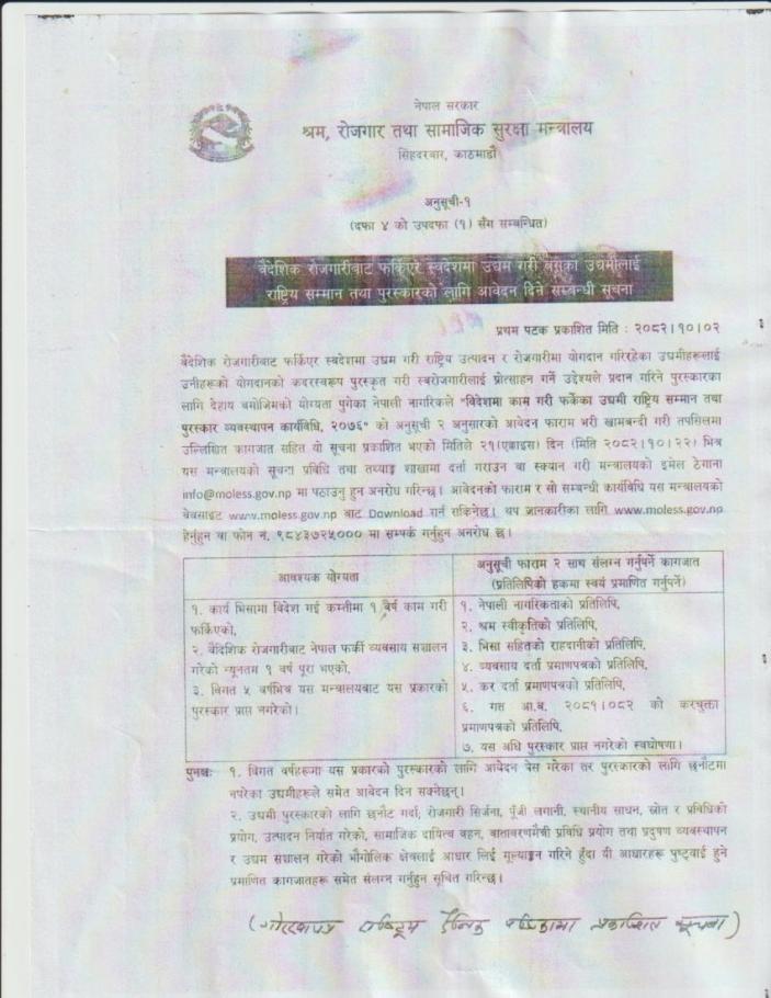 वैदेशिक रोजगारीबाट फर्किएर स्वदेशमा उद्यम गरी बसेका उद्यमीलाई राष्टिय सम्मान तथा पुरस्कारको लागि आवेदन दिने सम्बन्धी सूचना ।