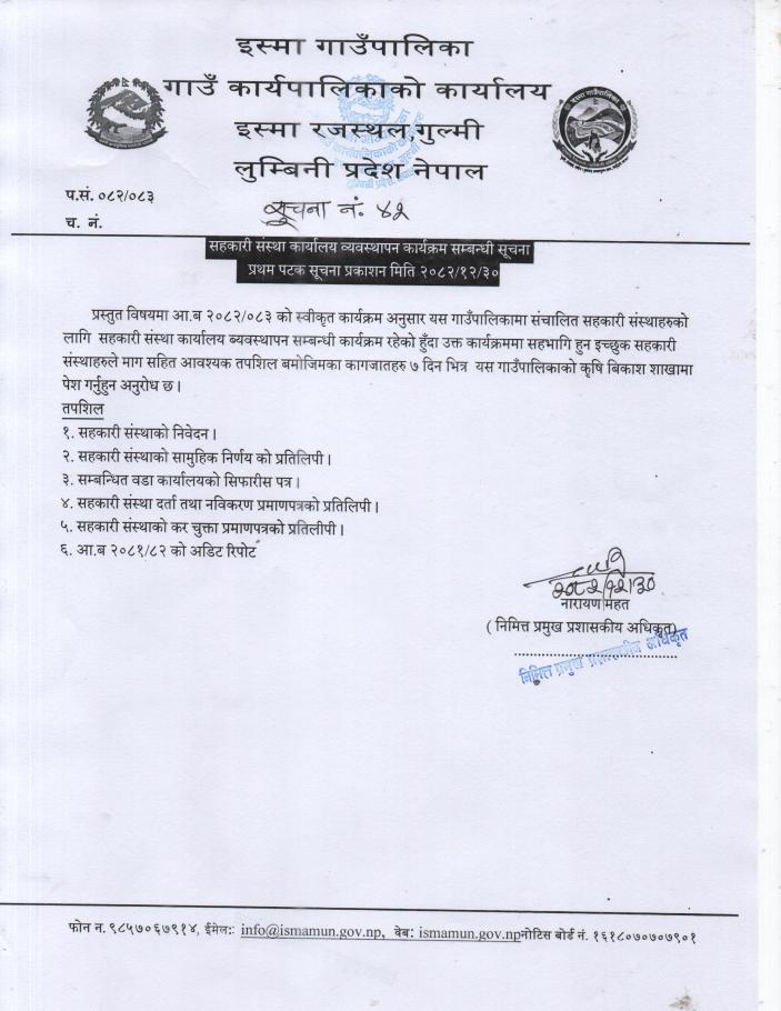 सहकारी संस्था कार्यालय व्यवस्थापन सम्बन्धी सूचना ।